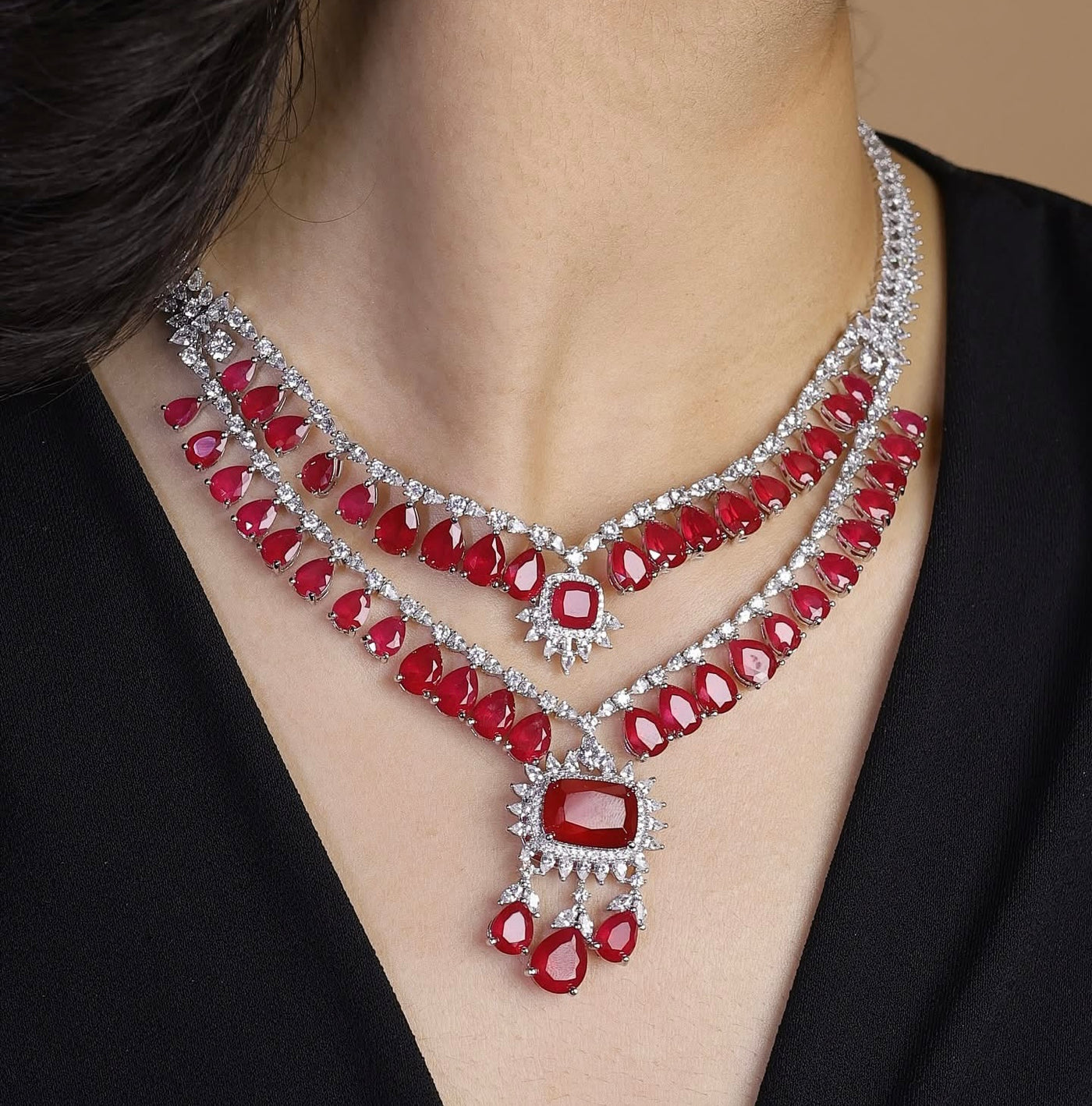 Turn every head with this A1 quality designer necklace, featuring rich ruby red stones beautifully paired with next-to-real diamond look detailing. Its layered design adds royal charm and elegance, making it the perfect statement piece for weddings, festive celebrations, or grand occasions. Crafted with precision to give you a premium, luxurious finish that truly shines. ❤️✨