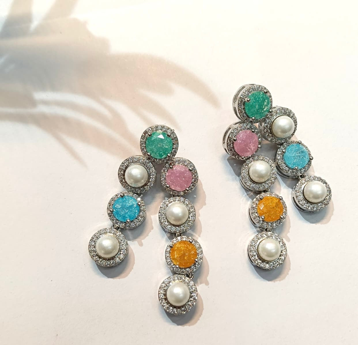 A playful fusion of pastel-colored zircon stones and luminous pearls, set in premium platinum-plated metal. Hypoallergenic, tarnish-resistant, and handcrafted to capture the sweetness of elegance in every detail.