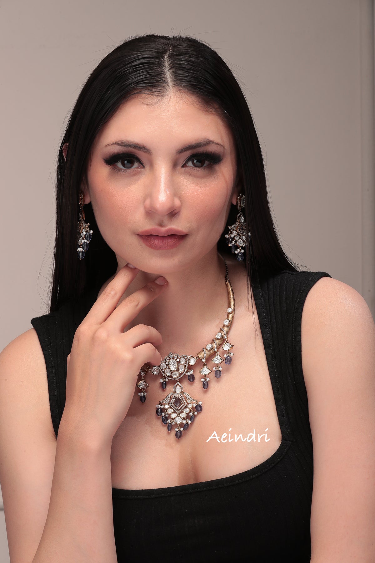 An opulent masterpiece, this necklace captures the essence of royalty and modern sophistication. Featuring dazzling polki stones set in intricate patterns, paired with delicate sapphire-blue drop accents, it exudes timeless elegance. The statement double-pendant design creates a bold focal point, perfect for elevating bridal, festive, or evening attire with a regal aura.