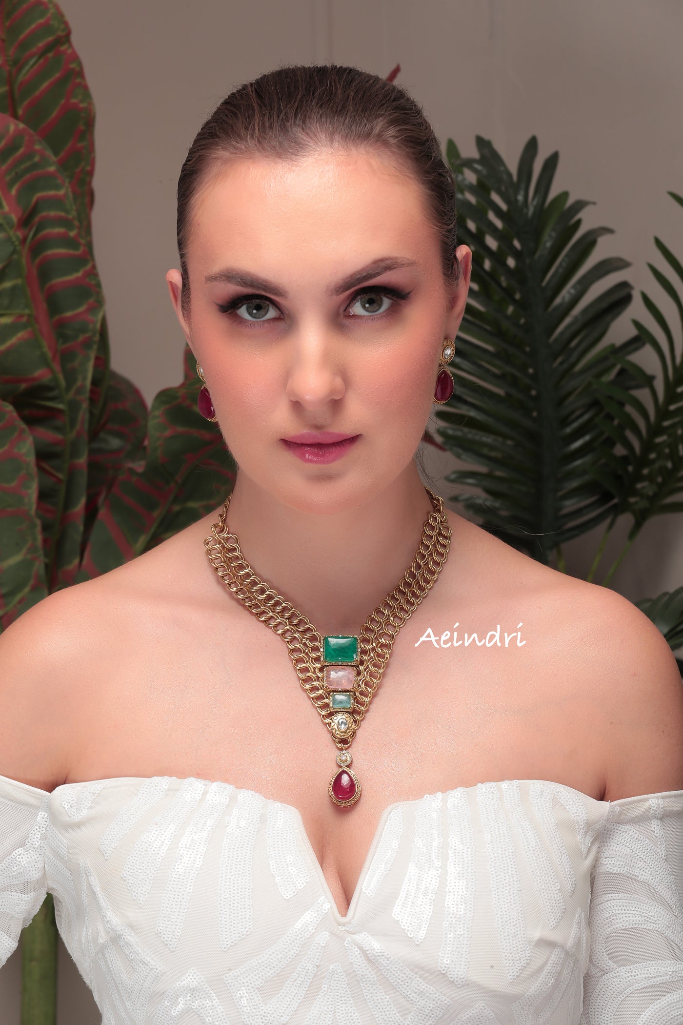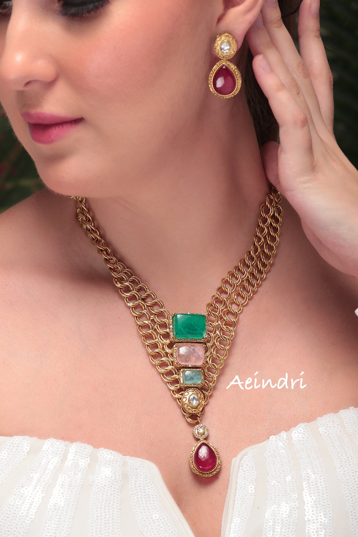 Make an unforgettable impression with this striking necklace set, designed with chunky gold-plated chains and embellished with square-cut emerald-green, pastel pink, and vibrant ruby-red stones. The layered arrangement of stones, highlighted with polki-inspired detailing, creates a royal fusion of modern elegance and traditional grandeur. Paired with matching ruby drop earrings, this set is perfect for weddings, festive occasions, or evening soirées.
