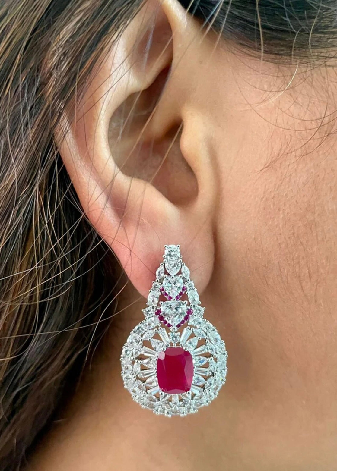 Red floral carved necklace featuring cushion cut ruby, diamond, crystal & Swarovski embellishments. Paired with matching earrings adorned with similar embellishments.