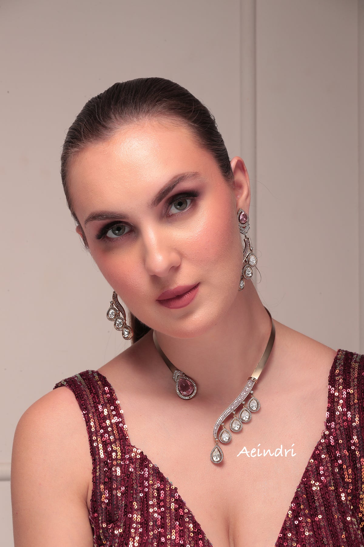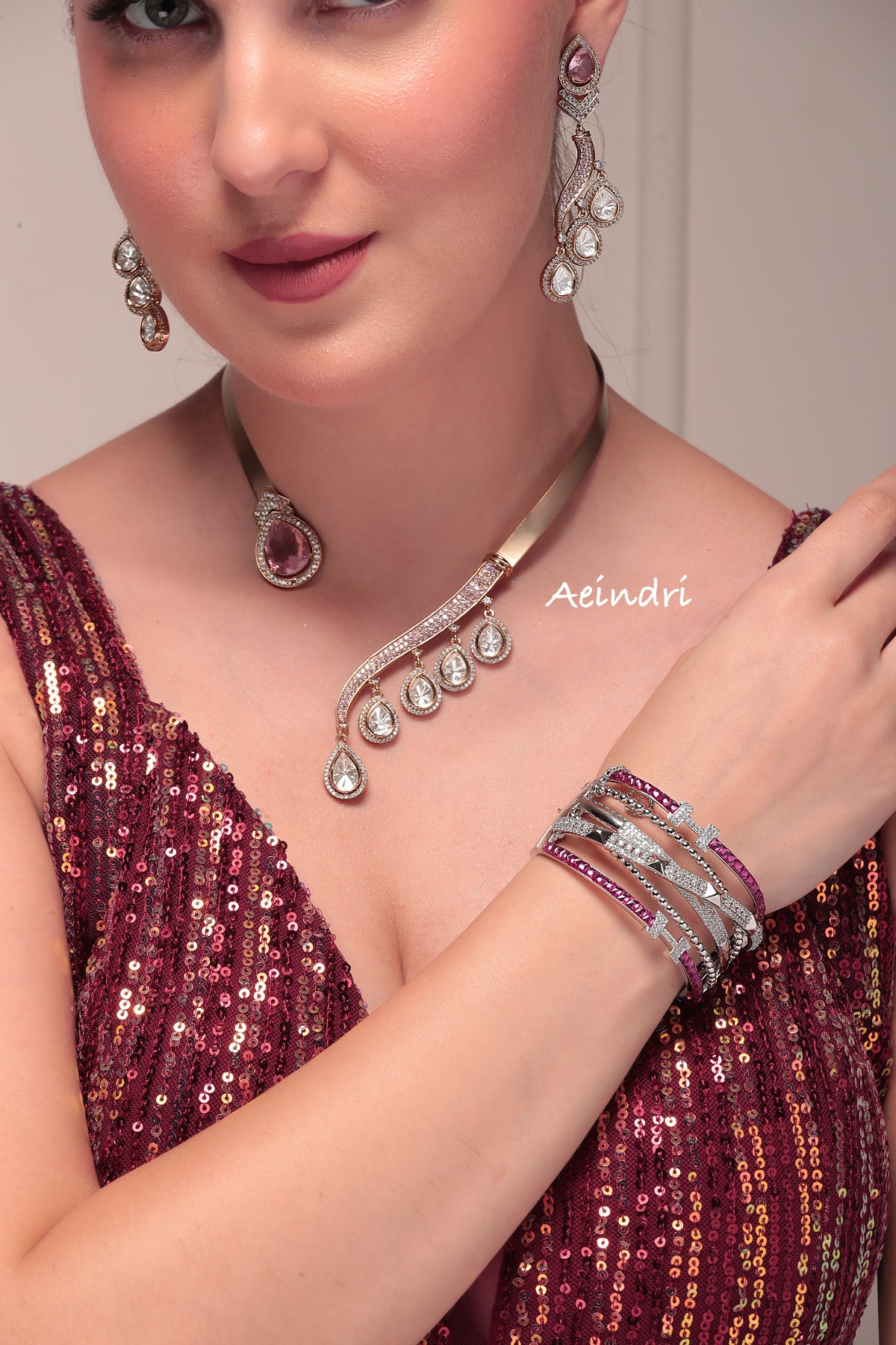 This Aeindri designer necklace redefines modern elegance with its sleek asymmetric design. A bold teardrop centerpiece with a pink stone balances beautifully against a cascading row of crystal-studded teardrops, creating a striking harmony of sparkle and sophistication. Paired with long, intricately crafted earrings, this set is perfect for women who love to make a statement with effortless style.