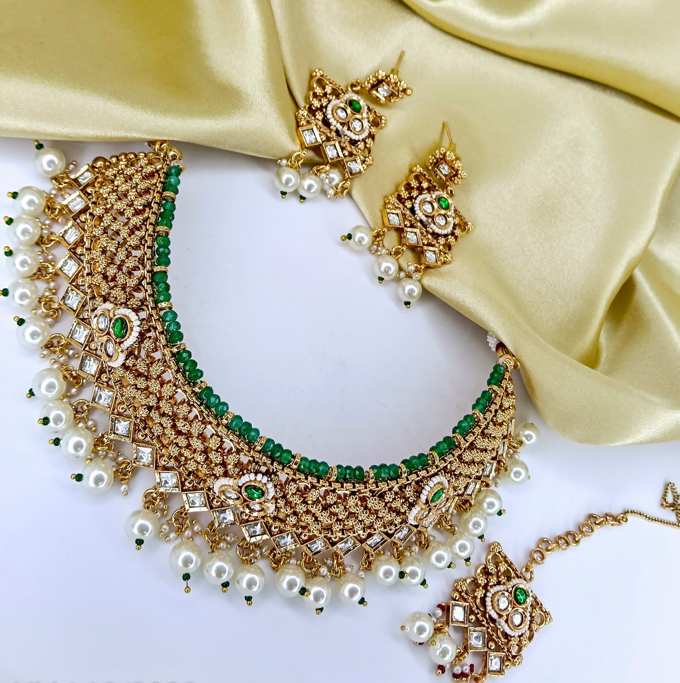 This masterpiece captures the charm of heritage jewelry with a next-to-real gold look. Designed with brilliant polki stones, green beads, and luminous pearls, it radiates regal sophistication. The broad choker-style necklace, paired with statement earrings and a matching maang tikka, makes this set an ideal choice for brides and festive occasions. With its intricate latticework and royal green-gold contrast, it’s an heirloom-worthy treasure.