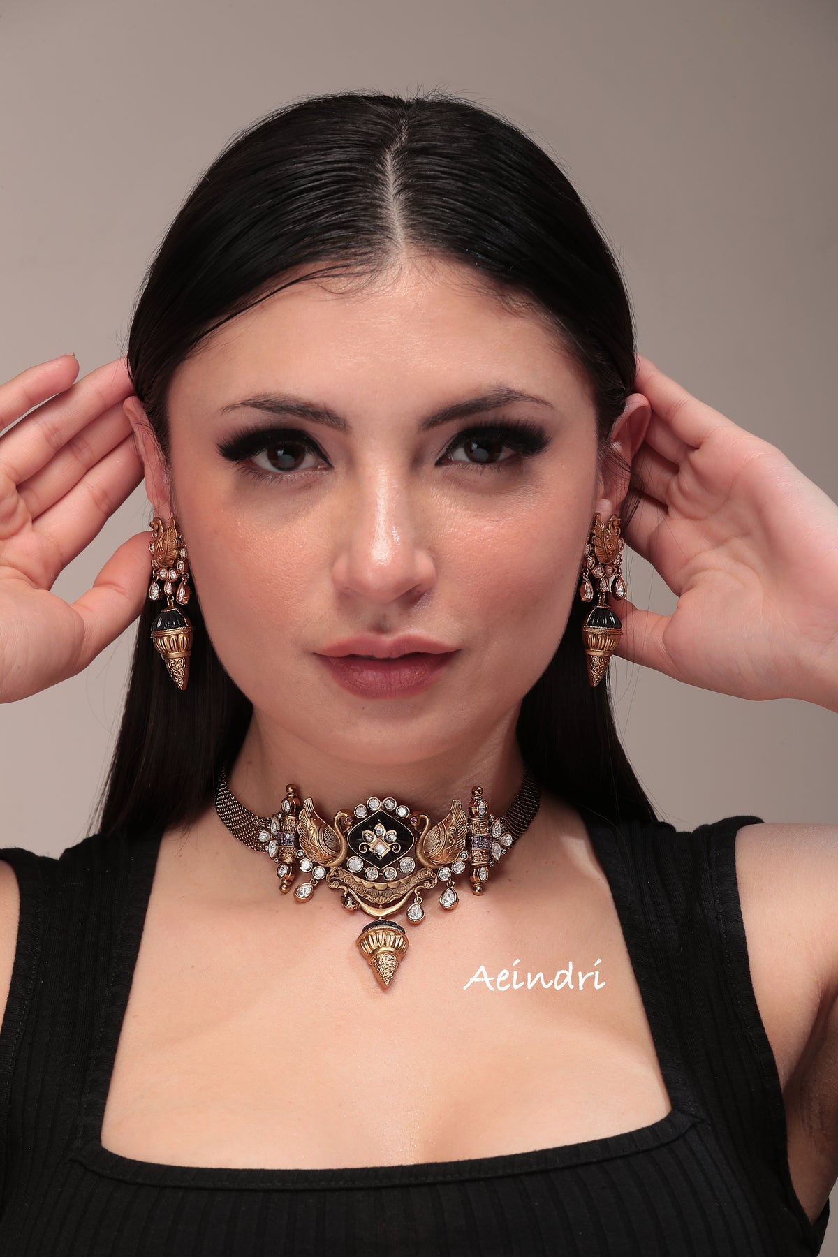 A masterpiece of traditional artistry, this antique-style choker necklace celebrates timeless heritage with a bold, regal appeal. The design features intricate gold-tone motifs of peacocks on either side, accented with sparkling crystals and black enamel detailing. The statement drop pendant adds depth and grandeur, while matching earrings complete the majestic look. Perfect for weddings, festive occasions, and cultural celebrations, this piece is made to turn heads with its old-world charm and luxury finish.